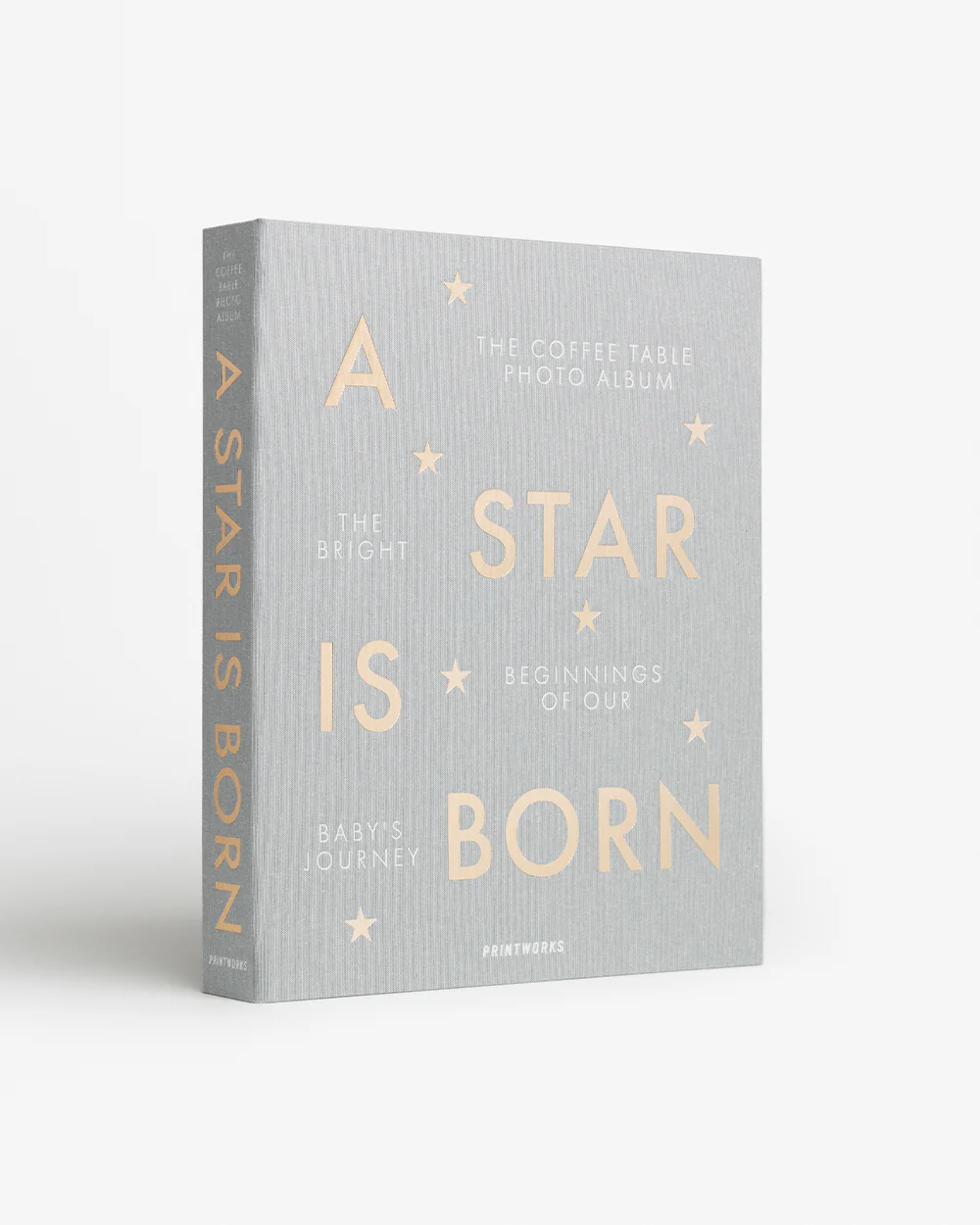 Celebra i traguardi del tuo piccolo con l’album fotografico da tavolo A Star Is Born, caratterizzato da una raffinata copertina in tessuto grigio con scritta in lamina oro.