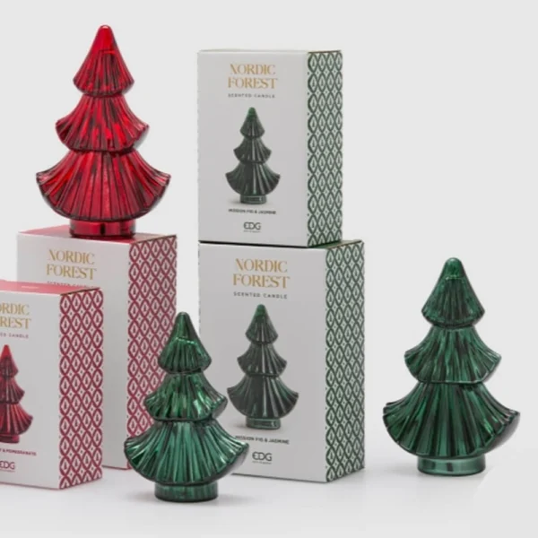 La candela profumata EDG – Enzo De Gasperi della collezione Nordic Forest si distingue per il suo design elegante a pino stilizzato, realizzato in vetro rosso bordeaux lucido con raffinato effetto plissettato.