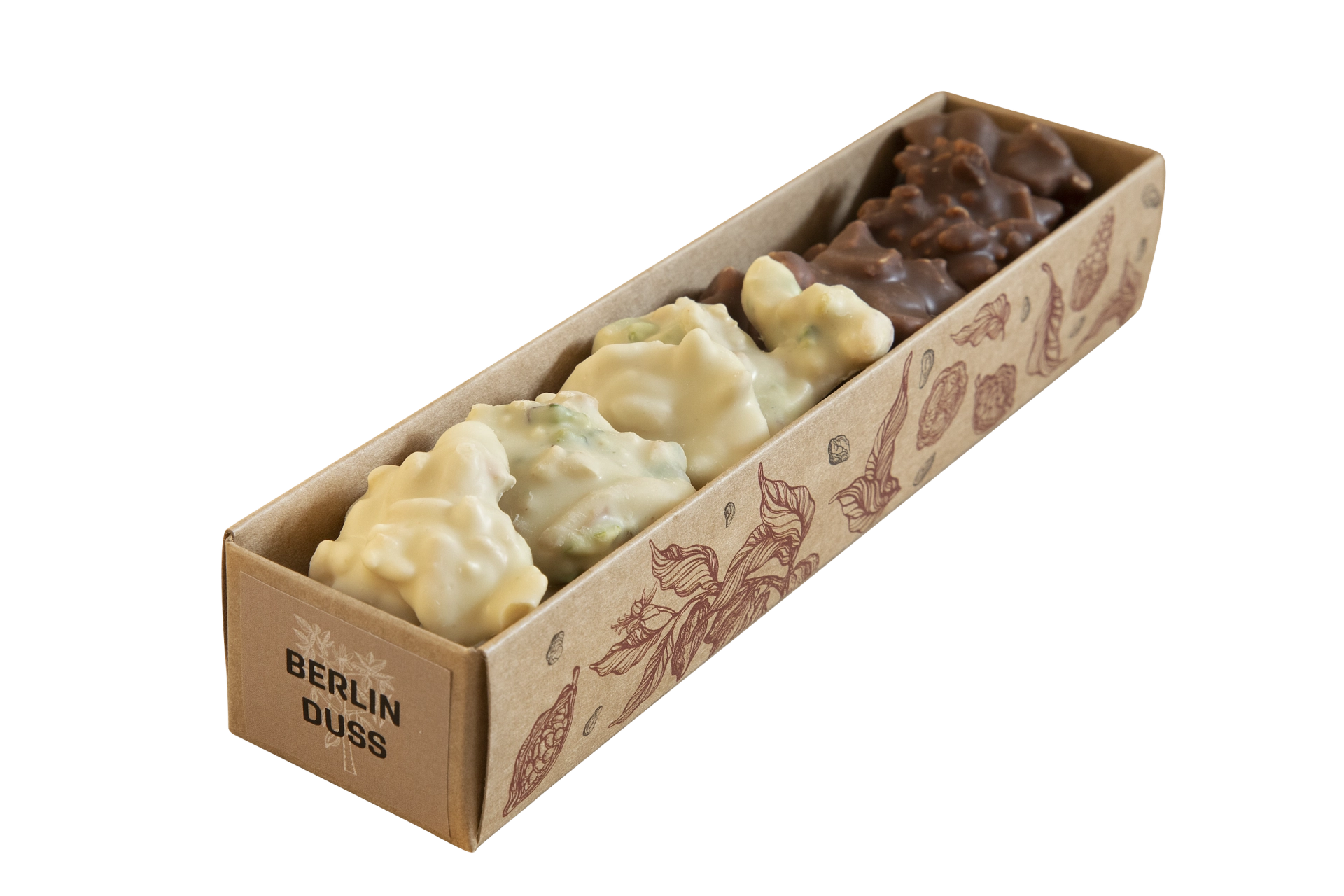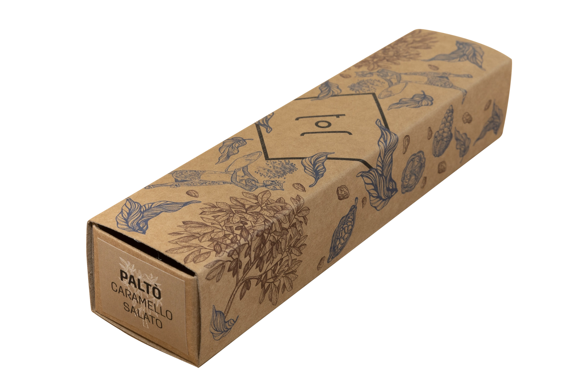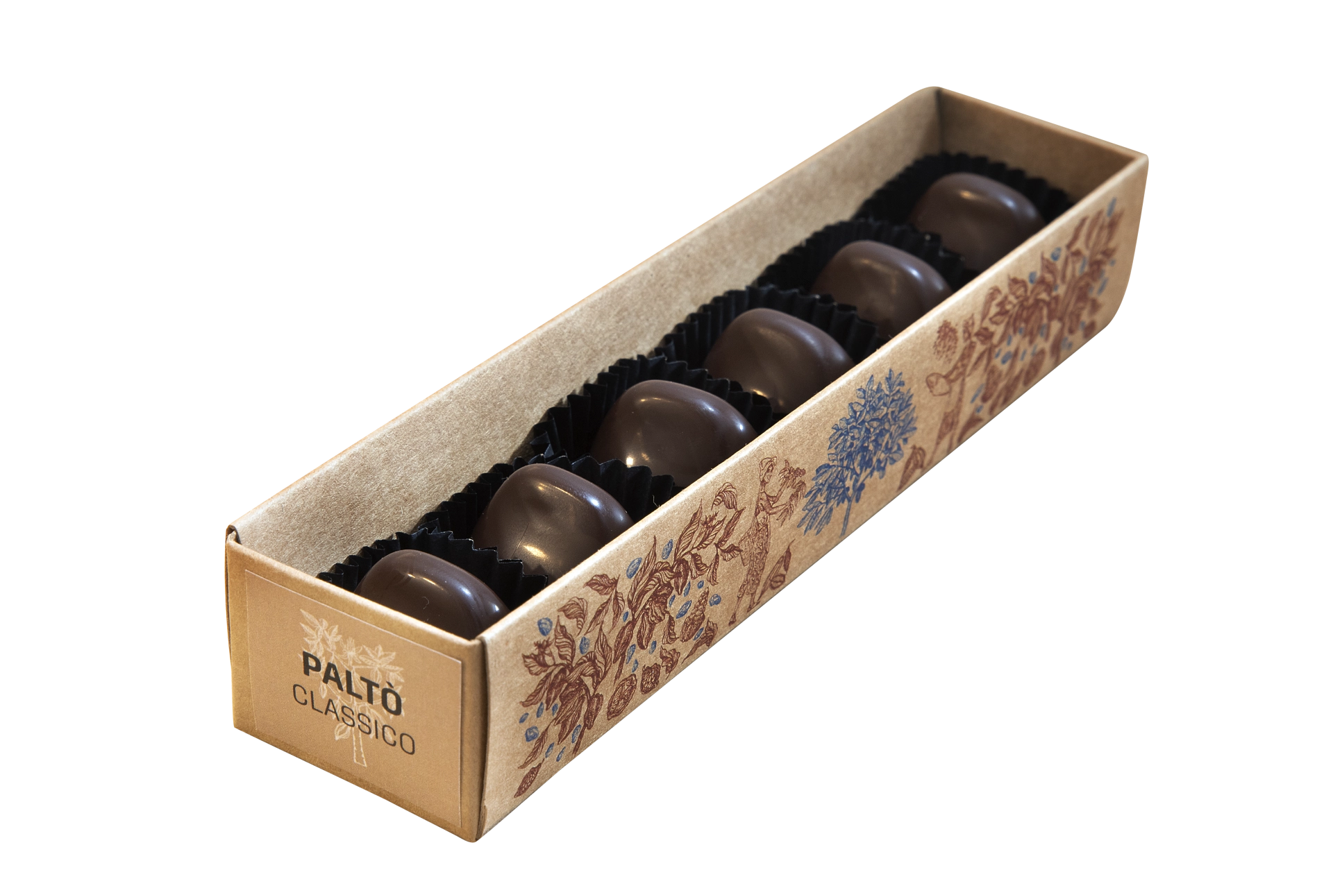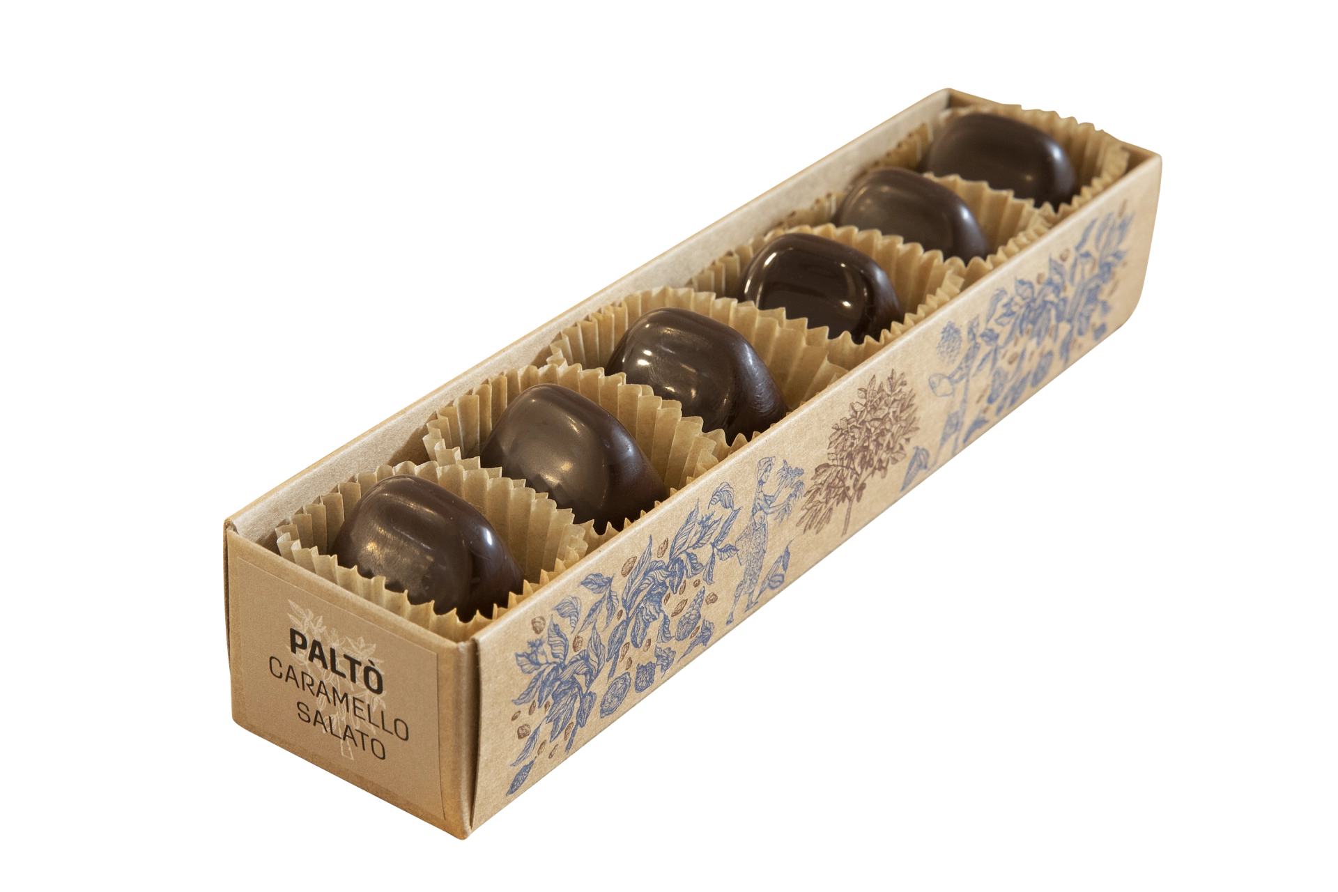 Nella confezione da sinistra a destra: Gianduia classico, Gianduia fondente, Gianduia salato, Gianduia agli agrumi