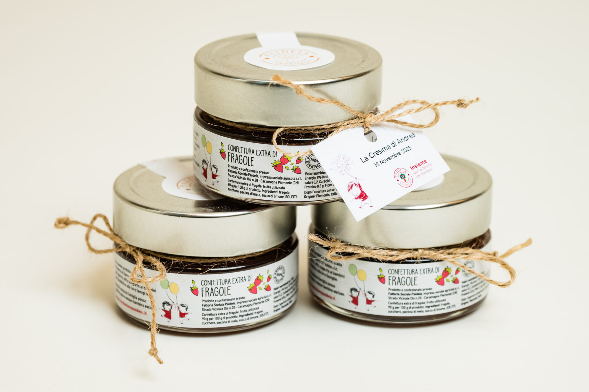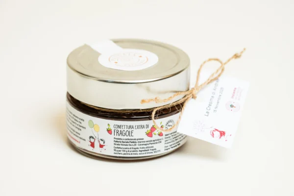 Questa confettura di fragole, preparata con frutti coltivati nella Fattoria Sociale Paideia, รจ simbolo di cura e attenzione.