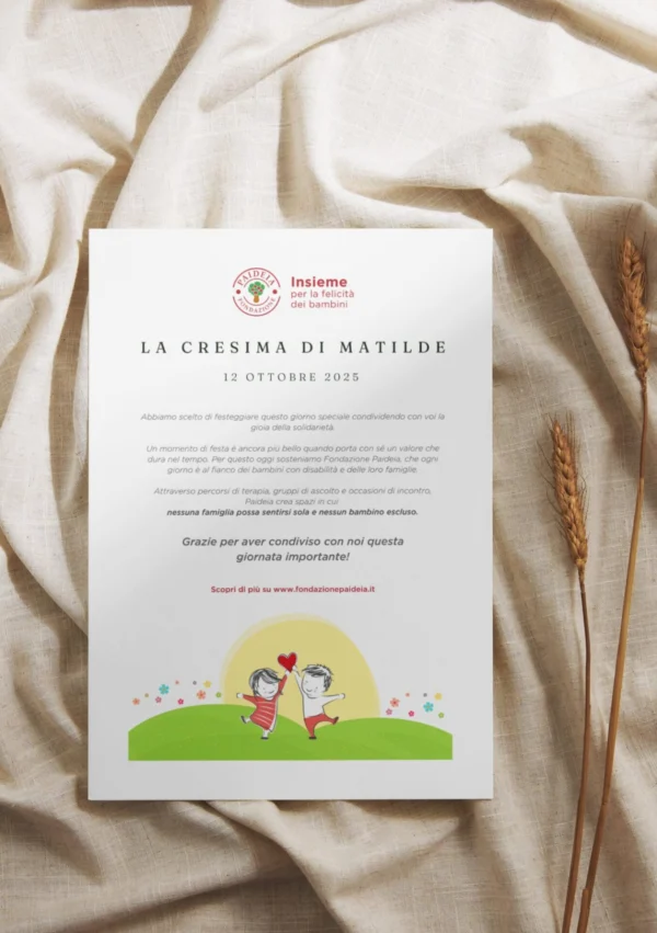 ll ricavato della vendita dei prodotti solidali รจ interamente destinato alle attivitร di Fondazione Paideia, per offrire un sostegno concreto ai bambini con disabilitร e alle loro famiglie.