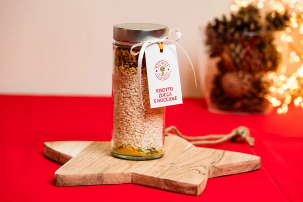 Tutto il buono del risotto giร pronto nel barattolo: riso, zucca e nocciole per un piatto dal sapore delicato e originale.