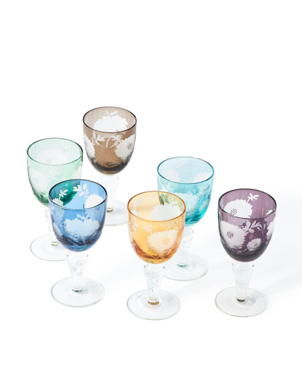 I nostri calici da vino “Peony” sono realizzati in vetro colorato e presentano una finitura sabbiata. P